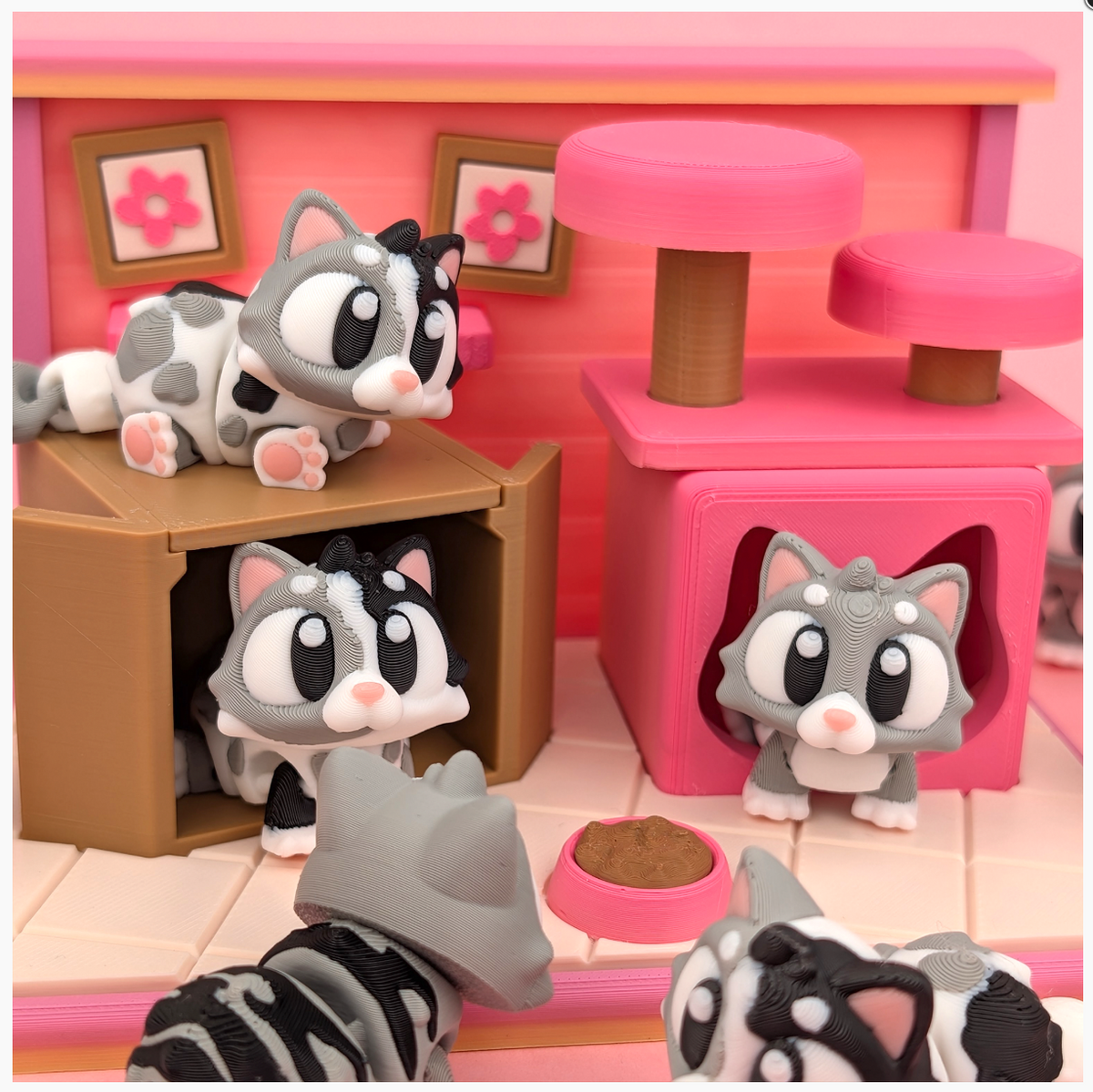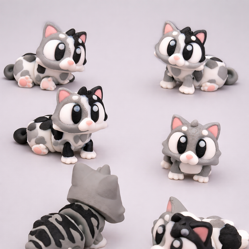 Add instant cuteness to your collection with our Flexi Cats Pack of 5! These charming kitty figures feature playful poses, expressive eyes, and smooth articulated bodies that make them irresistible. Finished in a cute grey, white, and black pattern with tiny paw details, theyβre perfect for desks, shelves, gifting, or collectible displays.